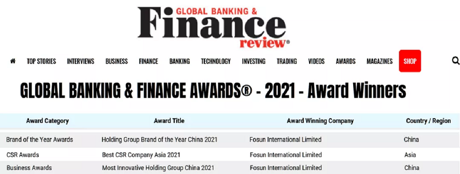 Le 2 août 2021, Fosun International a été informé par Global Banking and Finance Review, un célèbre magazine financier du Royaume-Uni, que Fosun International s'était vu décerner trois prix, à savoir « Corporate Social Responsibility (CSR) Awards - Best CSR Company Asia 2021 », « Brand of the Year Awards - Holding Group Brand of the Year China 2021 » et « Business Awards - Most Innovative Holding Group China 2021 », respectivement.